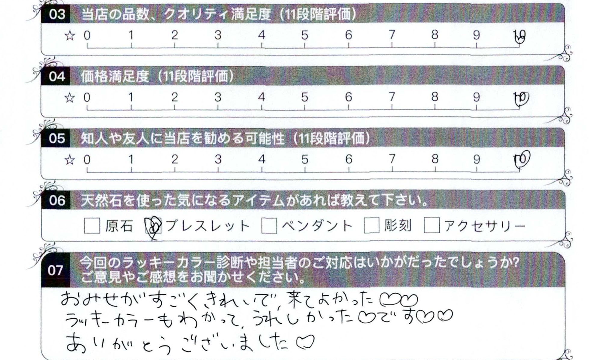 おみせがすごくきれいで、来てよかった♥ラッキーカラーもわかってうれしかったです♥ ありがとうございました♥